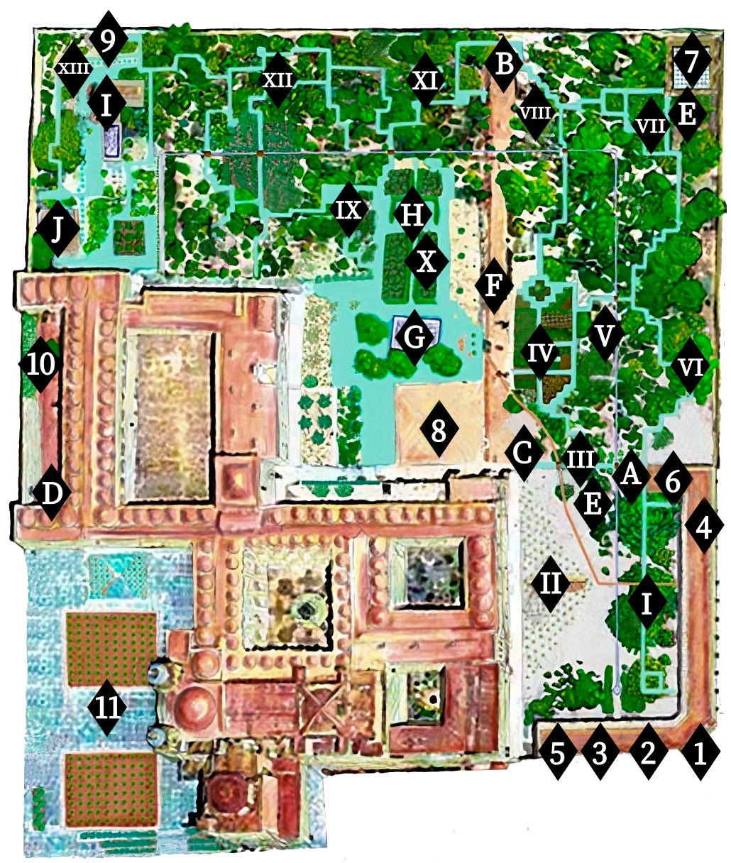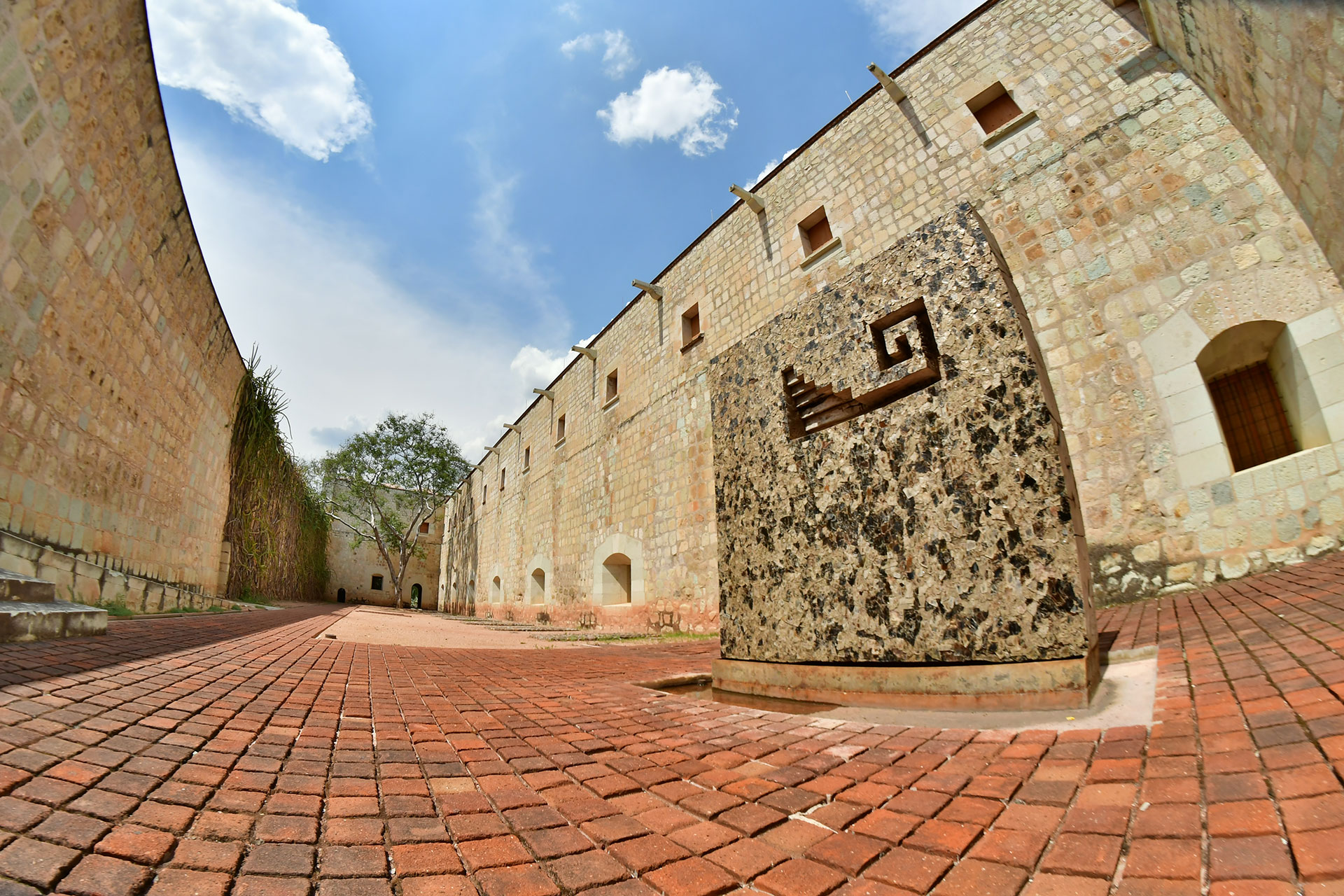 Cubierto con baldosas de barro rojo presenta dos importantes elementos en sus extremos: un gran árbol del Huaje, majestuosa leguminosa que da su nombre a la ciudad de Oaxaca y la grandiosa escultura "La Sangre de Mitla" obra también del Maestro Toledo.